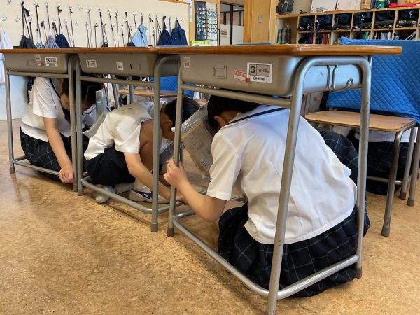 児童はその放送が聞こえると直ぐに机下に入り、身を守っていました。