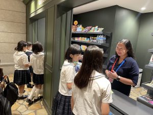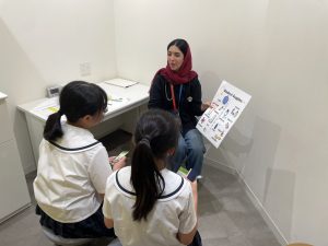 アトラクション・エリアでは、国際線の飛行機に乗った時や病院での診察の受け方、お土産の買い方などを体験し、楽しそうに英語で会話をしていました。